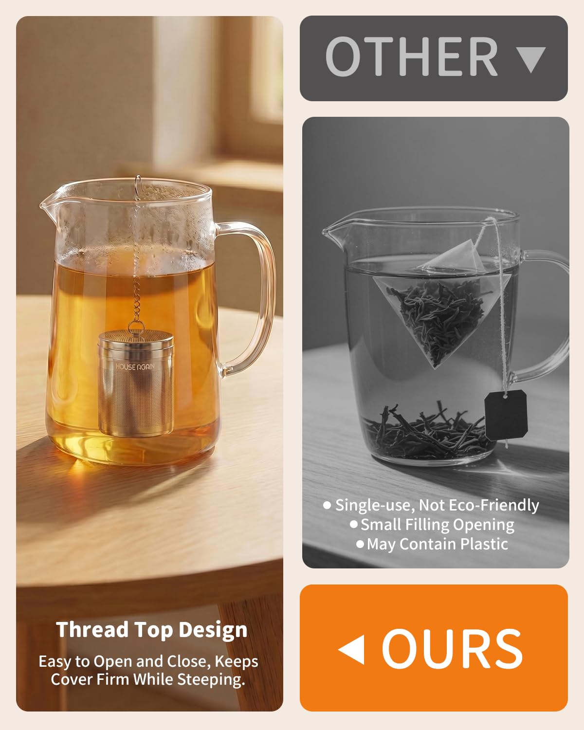Upgraded Micron Mesh:The mesh of the House Again tea filters, thanks to a more advanced perforation process, can be micron-sized to trap the smallest tea particles. No tea dregs to bother you. Loose leaf tea steeper is Ideal to hold tea leaves, particles, or ground coffee