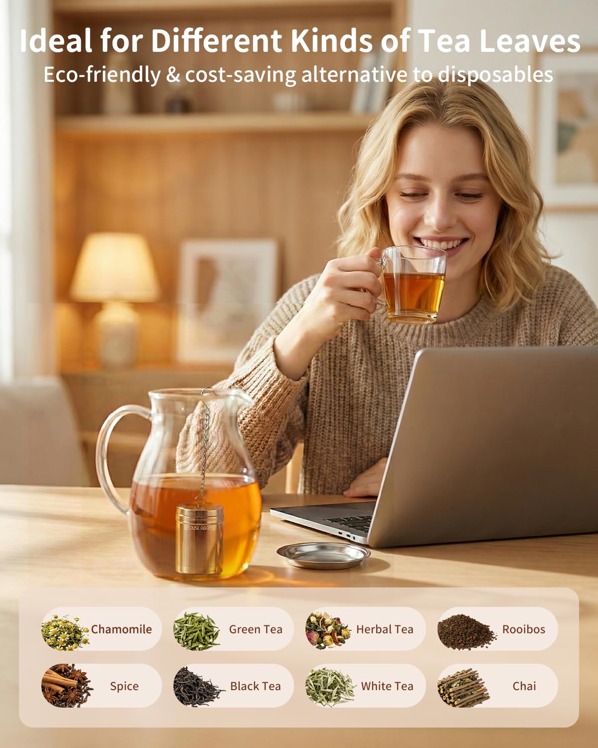 Easy to Use & Clean: Our updated slim threaded lid screws on effortlessly, ensuring a tight, secure seal to lock in all tea particles— leaving no particles out of the top during brewing! After use, these loose tea strainers clean up quickly with water or in the dishwasher. Plus, each tea steeper for loose tea includes a mini drip tray to rest on, preventing spills and keeping surfaces tidy after brewing