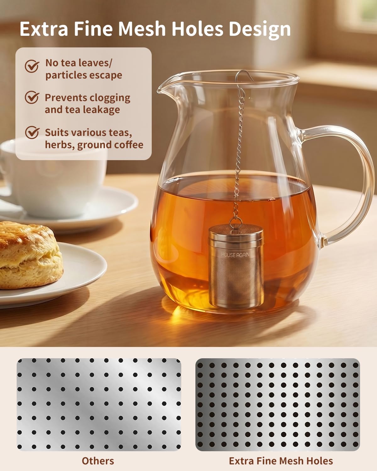 Upgraded Micron Mesh:The mesh of the House Again tea filters, thanks to a more advanced perforation process, can be micron-sized to trap the smallest tea particles. No tea dregs to bother you. Loose leaf tea steeper is Ideal to hold tea leaves, particles, or ground coffee