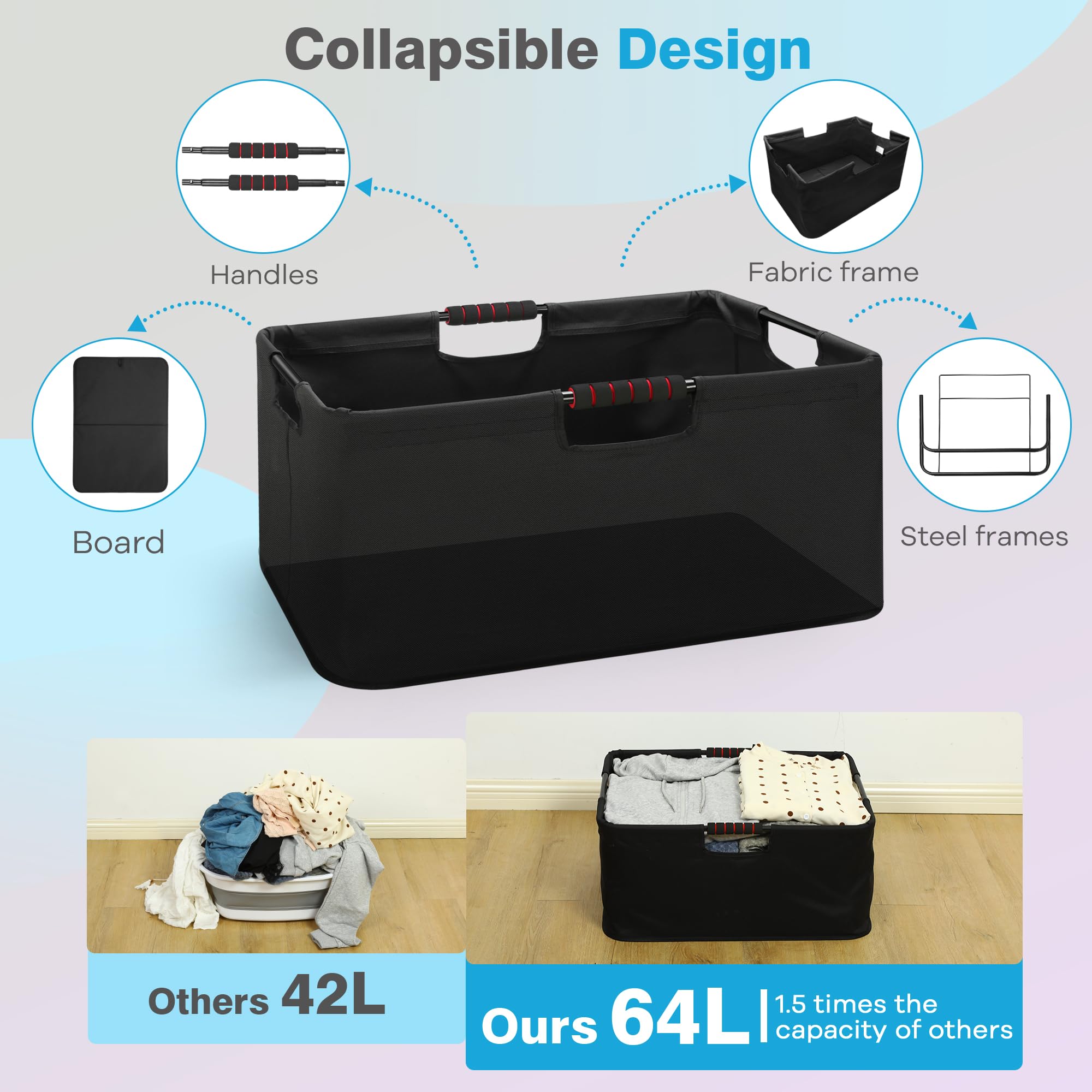 Large Capacity: Size 23''x16''x10.6''. It has a large capacity of 64L, which is much larger than a 24-inch suitcase when stacked. When unfolded, the hamper is large enough to hold the whole family's clothes, but when folded, it takes up minimal space. This versatile design is not only suitable for the laundry room, but also for the bedroom, basement, dormitory, and even for RV camping.