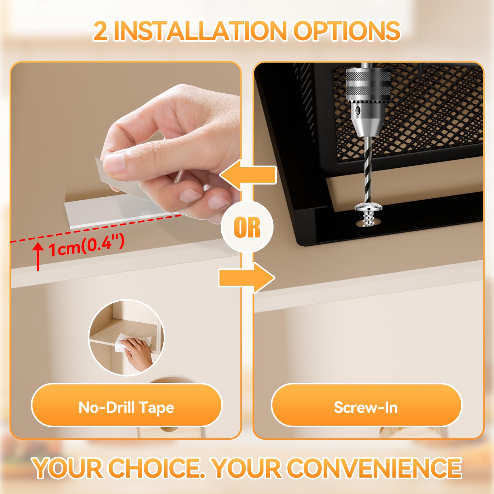 【Dual Installation for Upper and Deep Cabinets】This pull out cabinet organizer secures safely to you high and deep cabinetss with two choices. Use screws for a permanent, heavy-duty hold ideal for frequently accessed items. Or use the strong adhesive tape for a no-drill, 5-minute install that won't damage surfaces—perfect for renters
