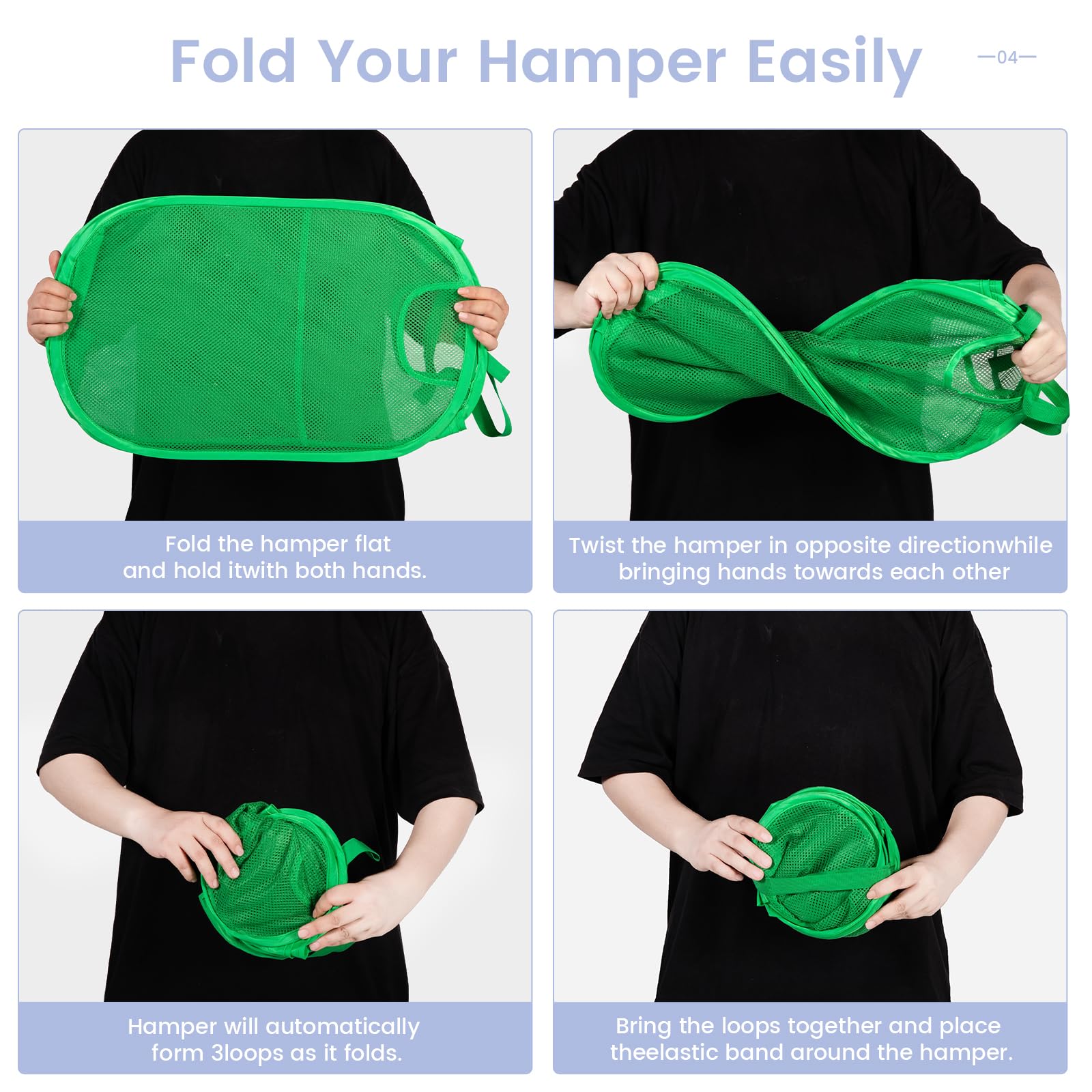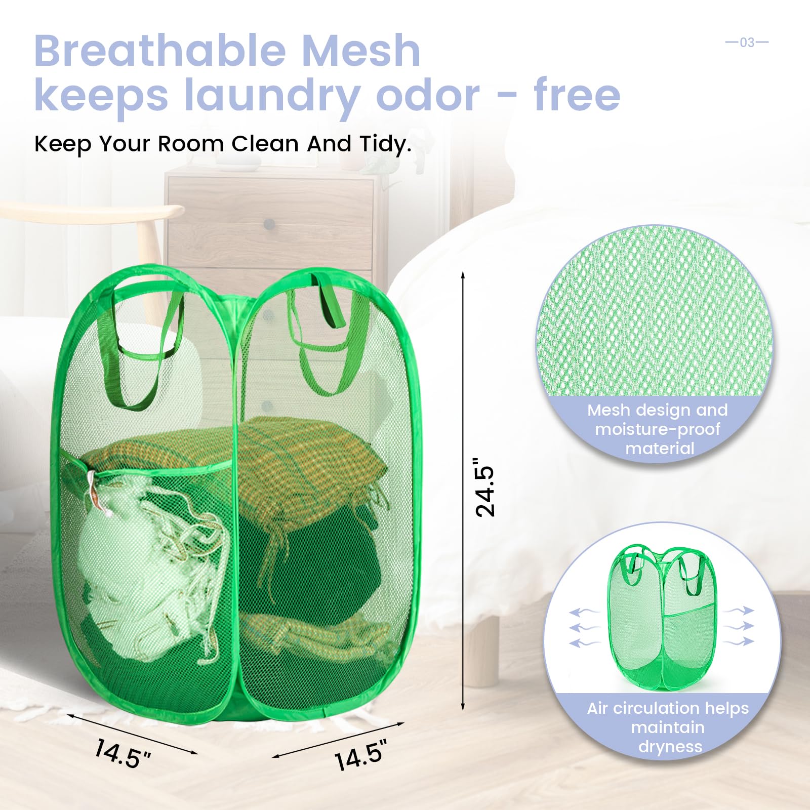 Breathable Mesh + Reinforced Handles:This collapsible laundry hamper features ventilated mesh walls to promote air flow and reduce odors, with sturdy handles for effortless clothes transport. Ideal for bedrooms, bathrooms, dorms, or travel