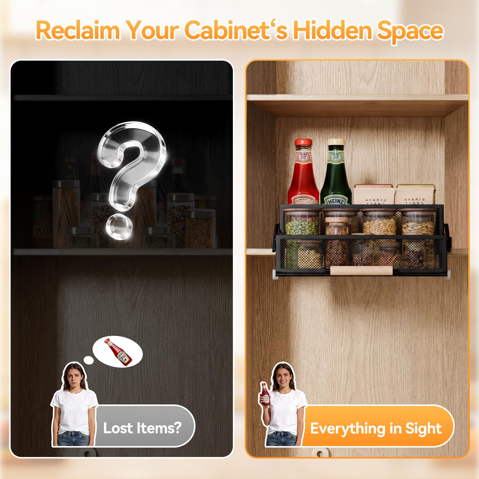 【Beyond the Kitchen: Organize Any High Cabinet】Designed to solve your kitchen’s high cabinet struggle, but its usefulness doesn’t stop there. Mount it anywhere with a door and depth: the bathroom for daily toiletries, the pantry for snack overflow, the garage for small hardware, or the closet for accessories. Wherever you have a cabinet and small items that play hide-and-seek, this pull-down shelf brings them to light