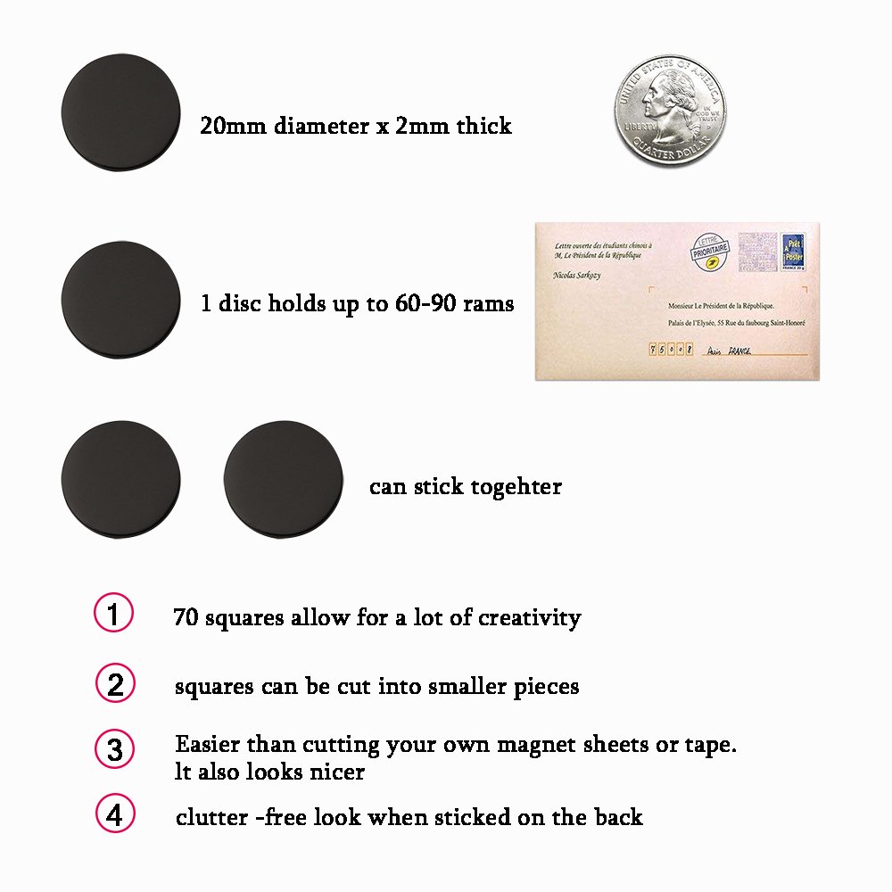 Just peel and stick: within seconds you can turn any small object into a magnet! From refrigerator magnets to pictures to organizing iron tools, you'll be surprised at the uses you'll find for it. Size: each small magnet diameters approx: 0.78" / 2cm, thickness: 2mm.