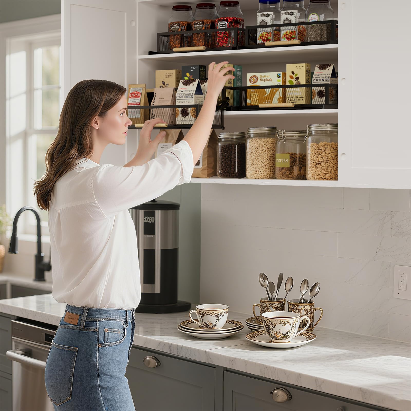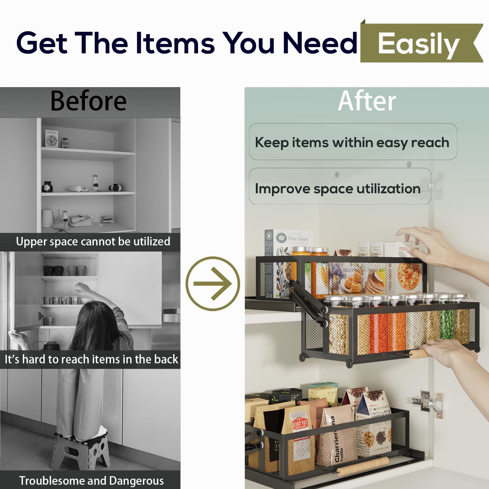 [Stable Construction, Sturdy&Durable]: Constructed from premium thick carbon steel material durable sliding cabinet organizer hardware and equipped with powerful tension springs. Pull the handle down vertically, prevent any shaking or tilting when dragging out, suitable for storing various glass bottles, plastic containers and other bagged or canned food.