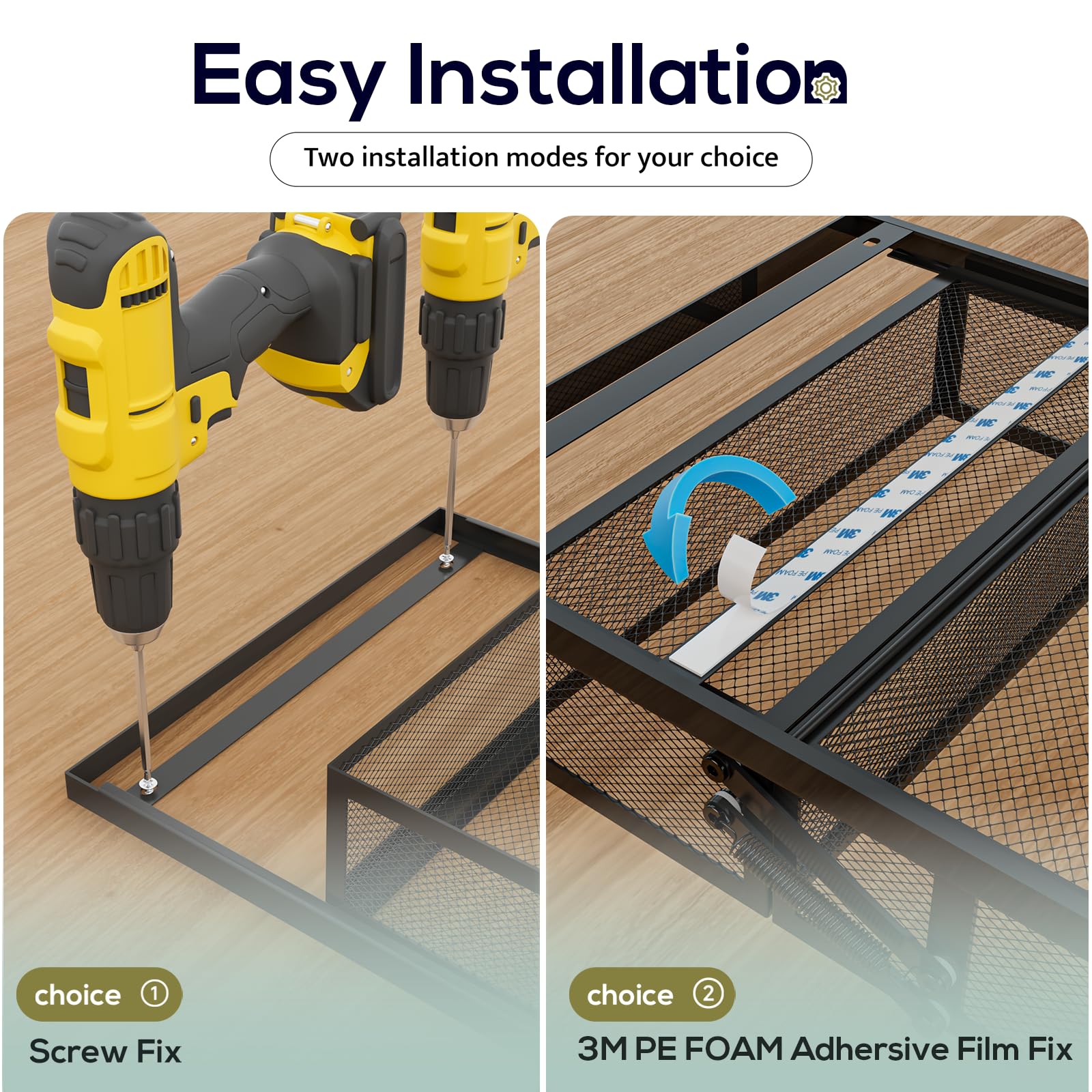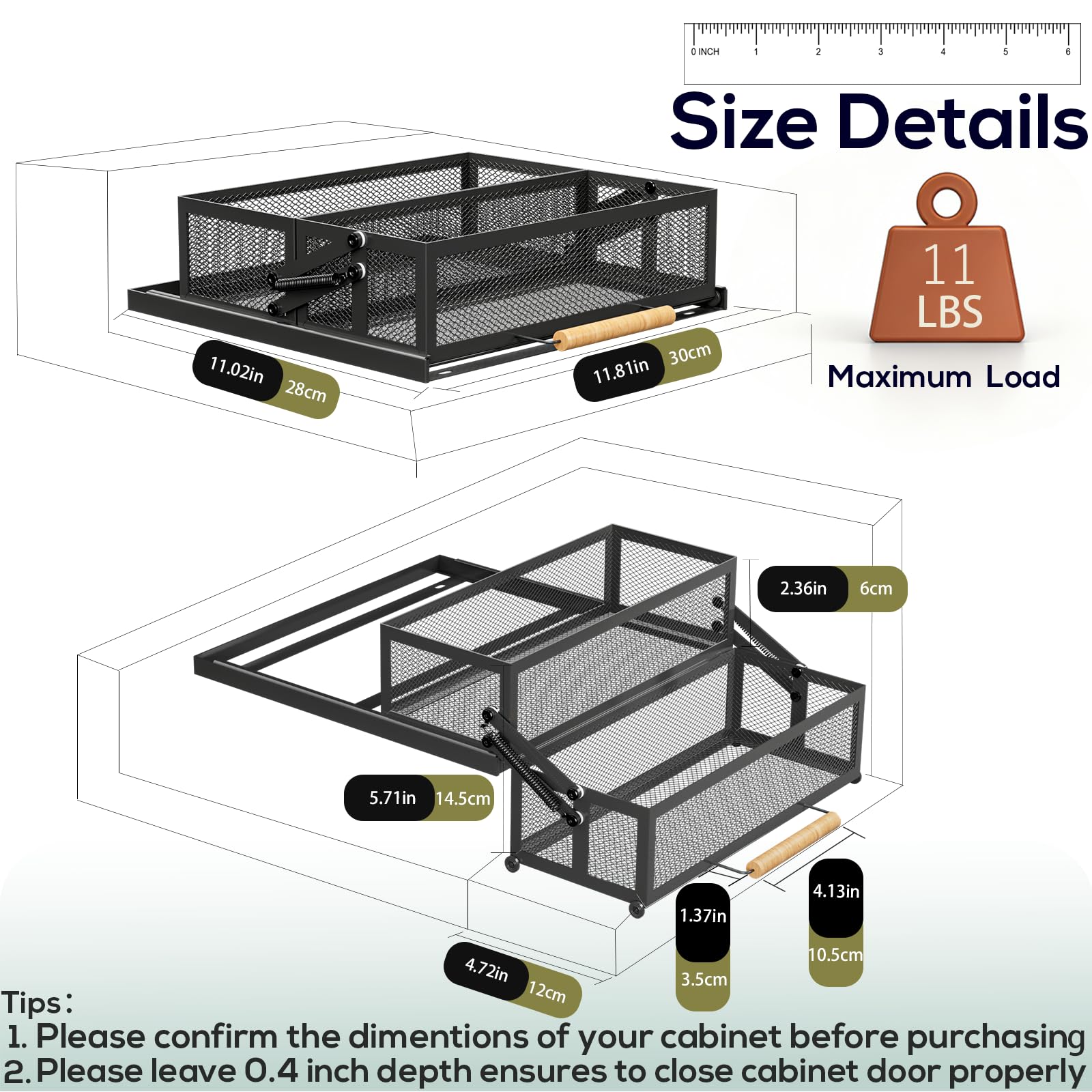 [Thoughtfully Sized, Two Fix Methods]: Measures (W x D x H) :11.8" x 11.1" x 3.5", fit for most standard-sized cabinets, cupboards and pantries. NOTE: When installing, please leave 0.4inch depth to ensure normal closing of the cabinet door. We provide 2 installation modes for your choice: Adhersive film fix & Screw fix with a maximum load of 11Lbs, no permanent damage to the cabinet.