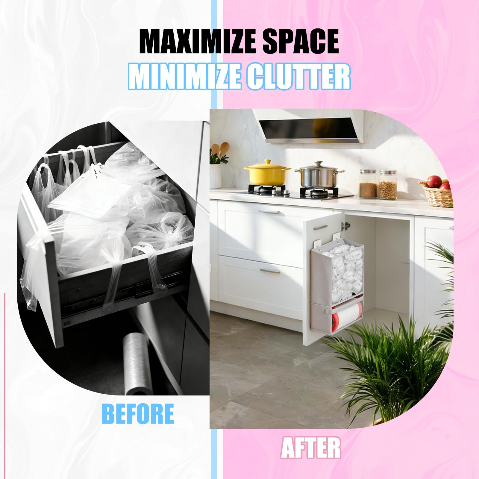 ⚡ Upgraded Extra Large Capacity: Efficiently stores 60+ plastic grocery bags or 30+ shopping bags. Features a dedicated dispenser for trash bag rolls up to 9.5" x 5", eliminating clutter and maximizing storage space.