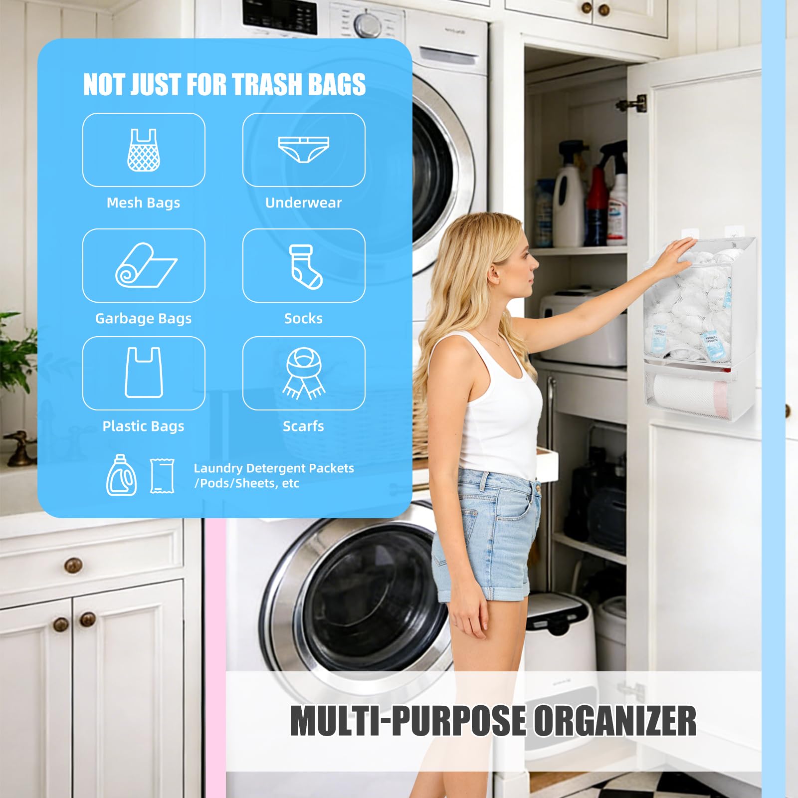 [[%F0%9F%93%A6]] Multifunctional Organizer: Designed for more than just shopping bags; ideal for storing socks, paper towel rolls, towels, and other lightweight household items(Like: Laundry detergent packets/pods/sheets, coffee creamer, sugar packets, tea bags,disposable gloves, etc.