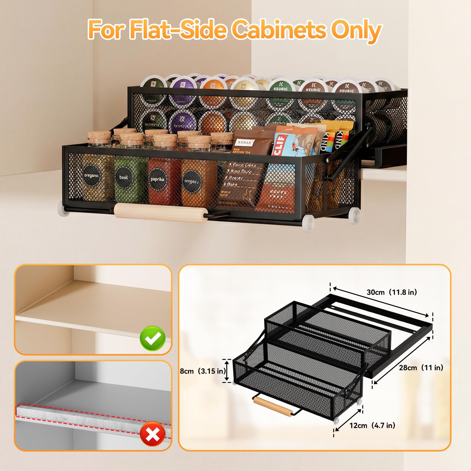 【Dual Installation for Upper and Deep Cabinets】This pull out cabinet organizer secures safely to you high and deep cabinetss with two choices. Use screws for a permanent, heavy-duty hold ideal for frequently accessed items. Or use the strong adhesive tape for a no-drill, 5-minute install that won't damage surfaces—perfect for renters