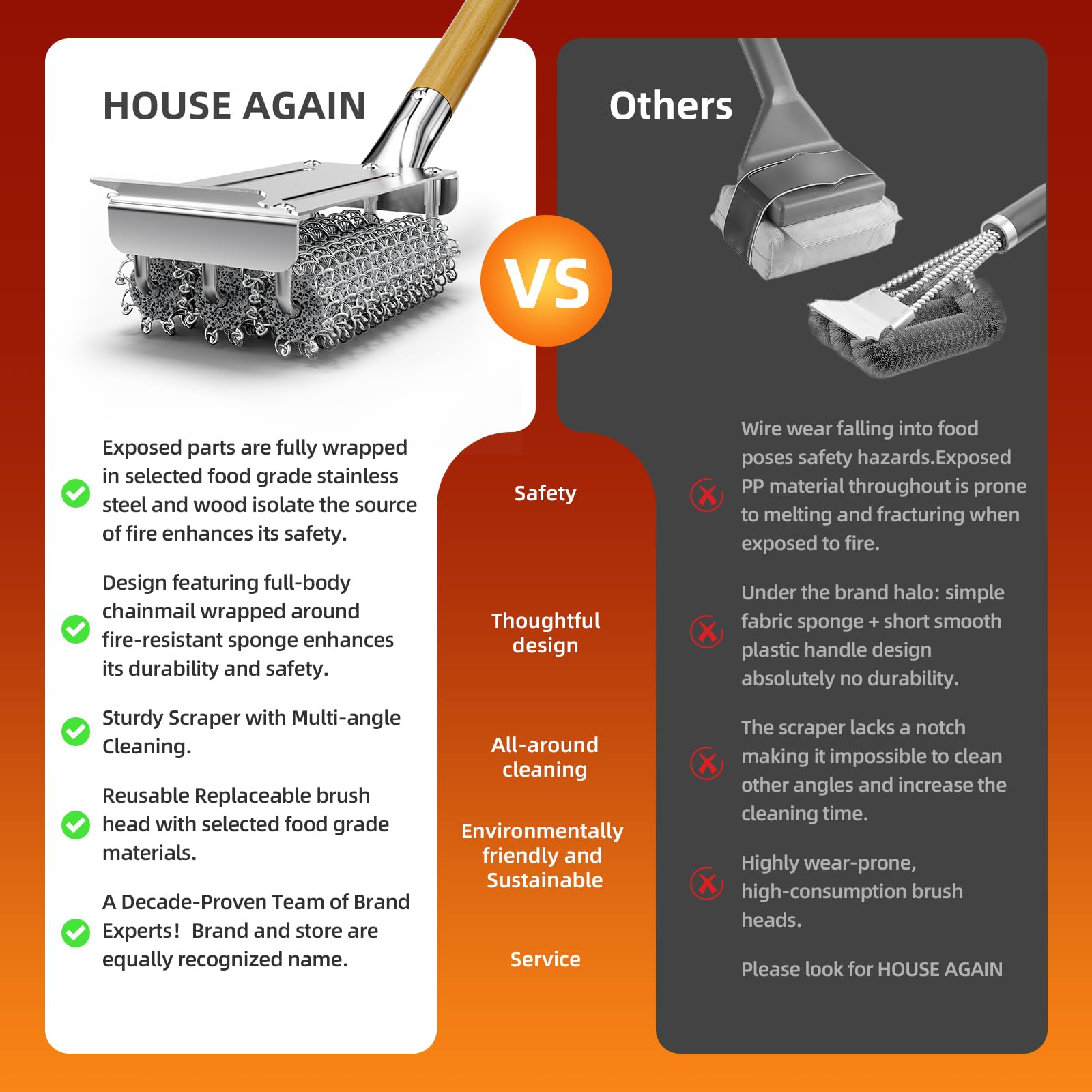 Bristle-Free Safety Design: HOUSE AGAIN own the revolutionary Grill Brush Bristle-Free with Patented Technology! Our rotating brush head features 304 Coiled Stainless Steel Mesh and Food-grade Silicone Sponge Core, eliminating the risk of bristle shedding found in traditional brushes, it maintains not only safe but also powerful&useful cleaning deal with gas/charcoal/porcelain grills.