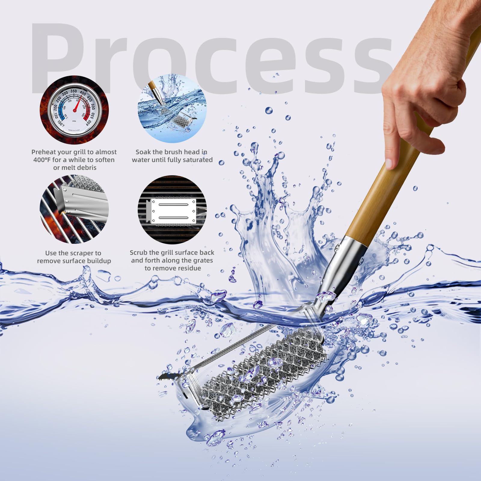 Grill Accessories with Powerful Cleaning Effect: Three rotatable cylinders wrapped with silicone sponge ensure 360-degree coverage of the side of the grill. Before use, soak the barbecue brush in water. When in use, the silicone sponge will constantly humidify the grill, effectively removes stains and debris. This is how our product works. You never thought you could clean the barbecue grill so easily.