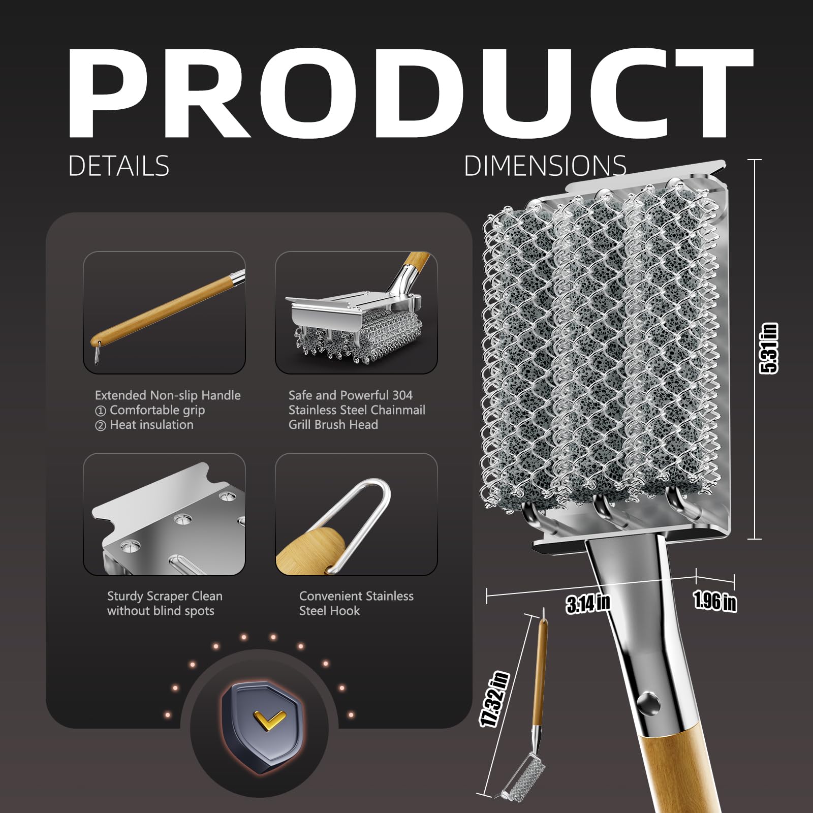 3-in-1 Cleaning System: Grill Scraper + Brush + Ergonomic Handle – Ultimate Grill Cleaning Kit! Integrated razor-sharp scraper removes stubborn residue, while silicone sponge absorbs grease and steel mesh polishes grates. The 13" wooden handle withstands high temperatures extends reach to grill corners, boosting efficiency by 200% for outdoor cooking.