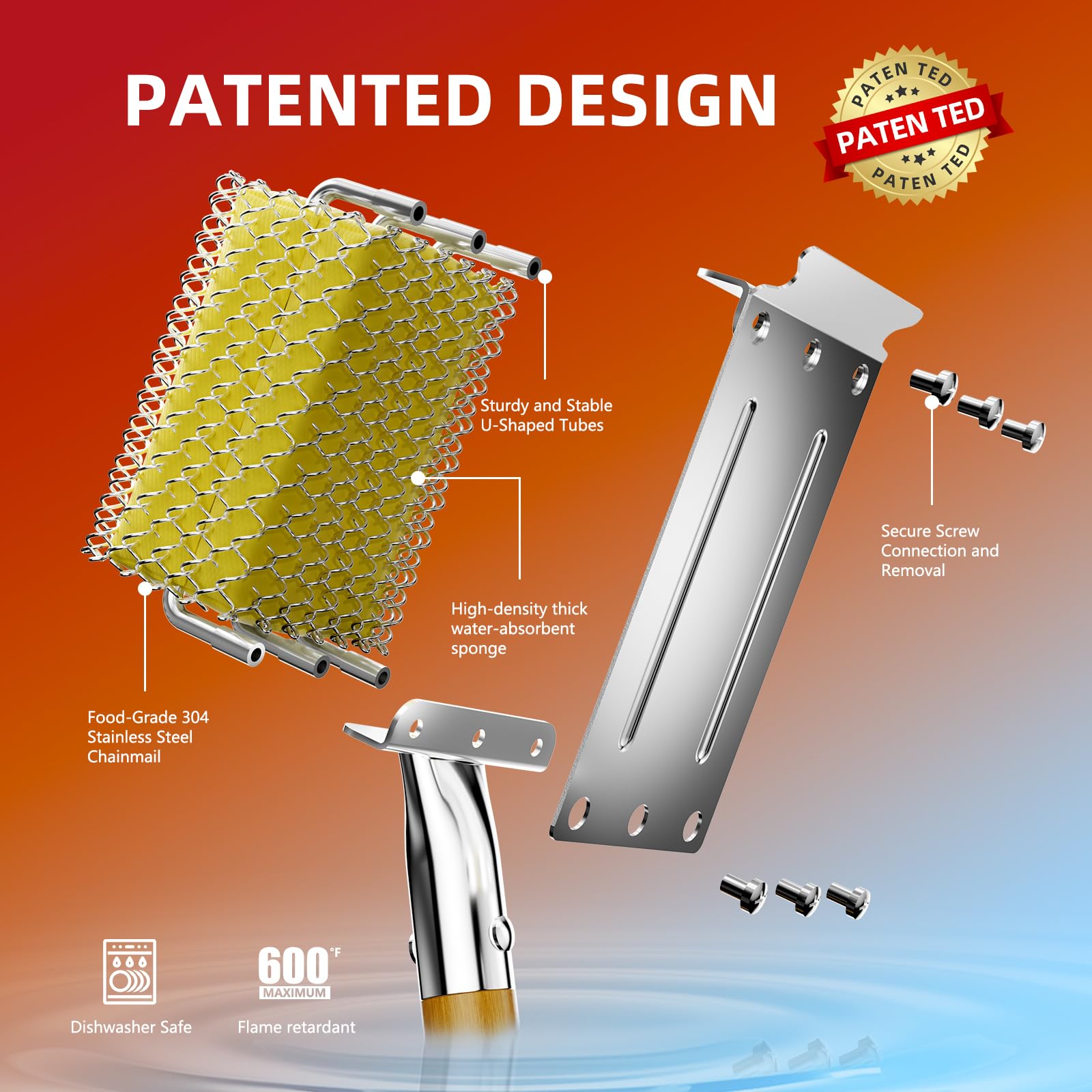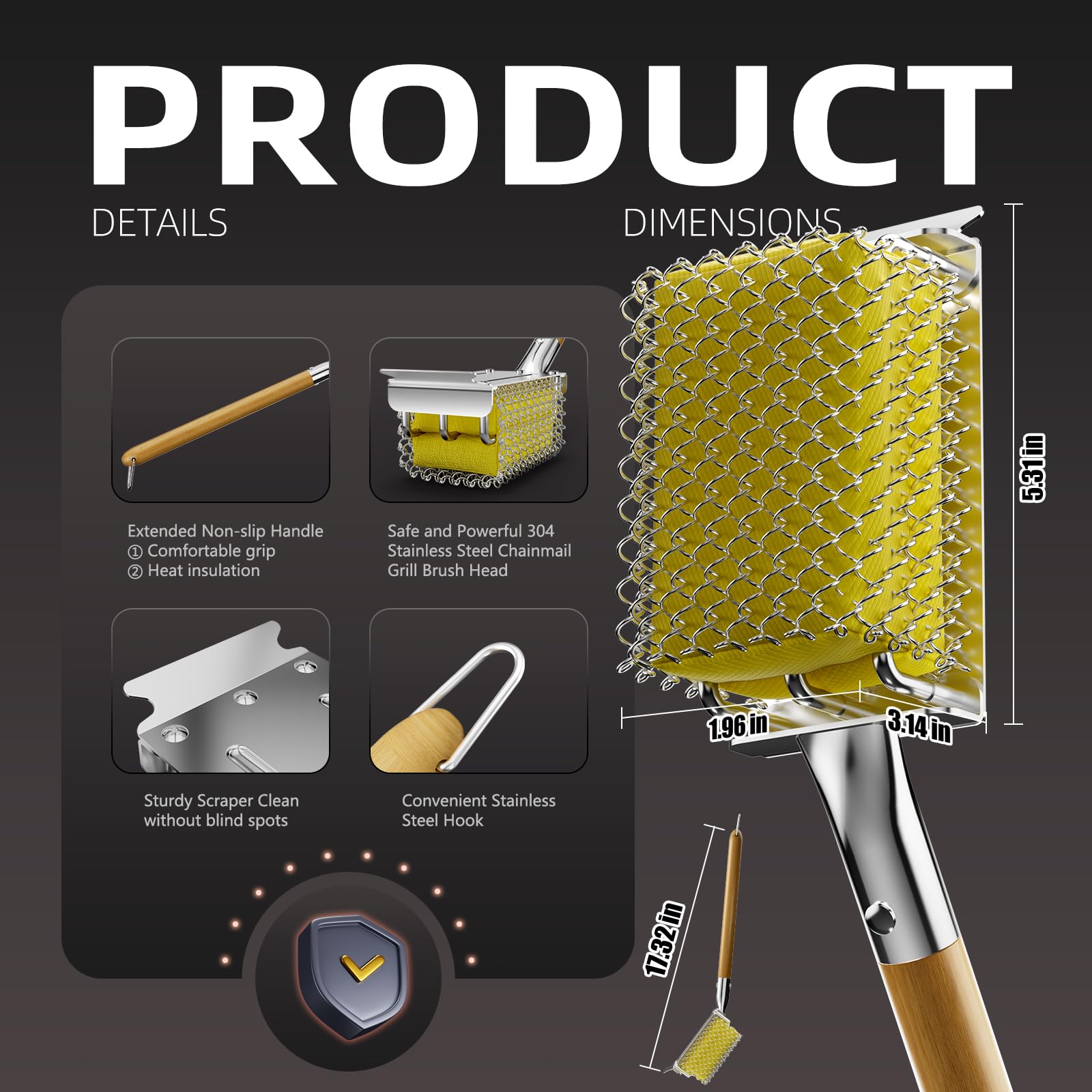 【3-in-1 Grill Tools for Faster Cleaning】- DEEP CLEANING SYSTEM WITH STEAM POWER to clean more area in less time! Boost your efficiency by 200% with our integrated Grill Scraper + Bristle Free Grill Brush(Design featuring full-body chainmail wrapped around fire-resistant fabric and sponge)+Long Wood Handle! which provides 360° coverage to wrap around grill grates.It tackles top, sides, and bottom grates simultaneously without damaging the surface. For best results, dip the brush in water before use, then trigger a Powerful Steam Effect that dissolves grease in under 30s.