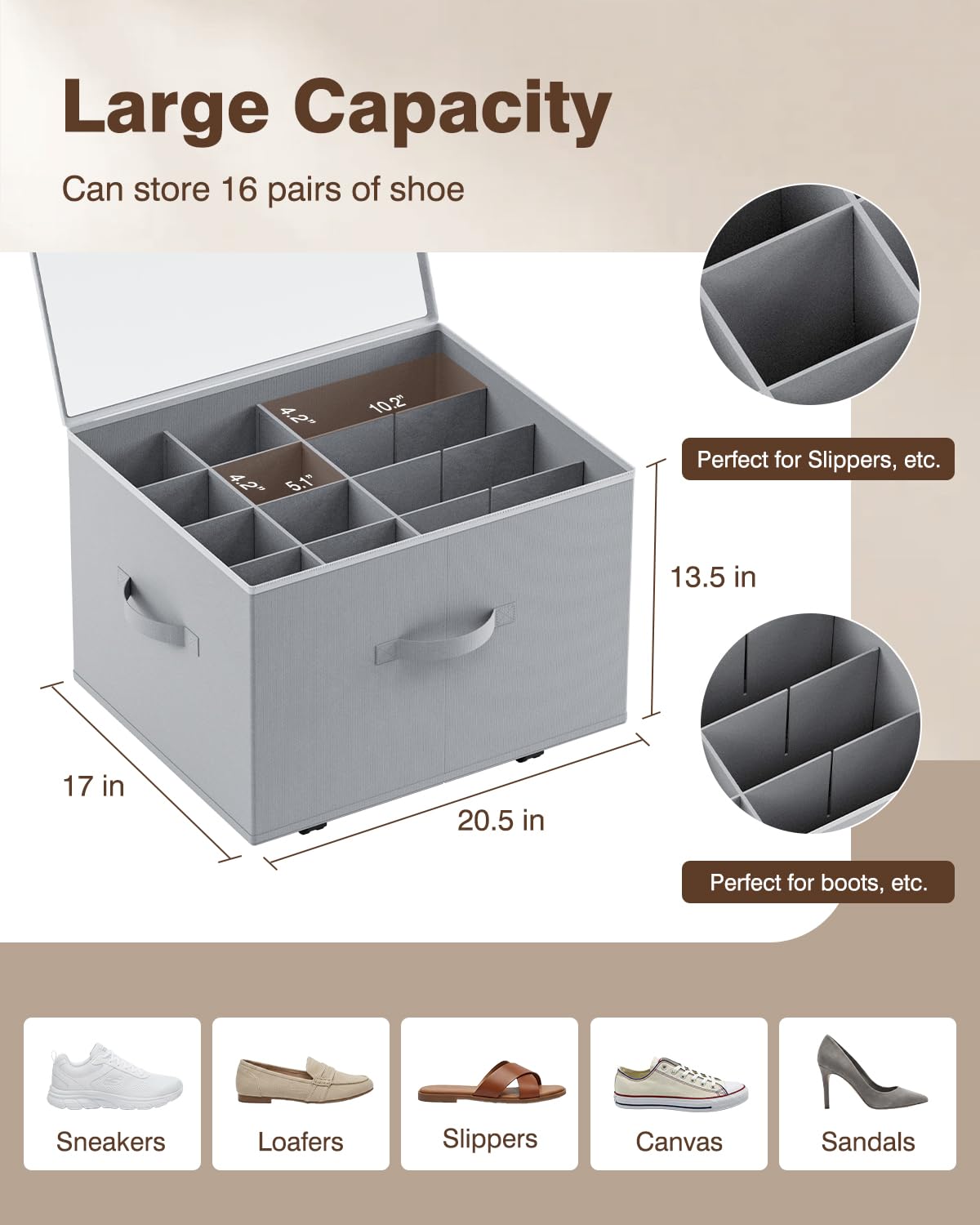 [[%F0%9F%91%9F]] 【Large-Capacity & Space-Saving】Say goodbye to messy piles! This shoes box storage (20.5"L x 17"W x 13.5"H) transforms any closet or entryway by storing 16 pairs in a fraction of the space. Our vertical design with independent shelves holds each shoe securely (5.1" x 4.2" per compartment). Preventing creases or damage—just a pristine, organized collection.