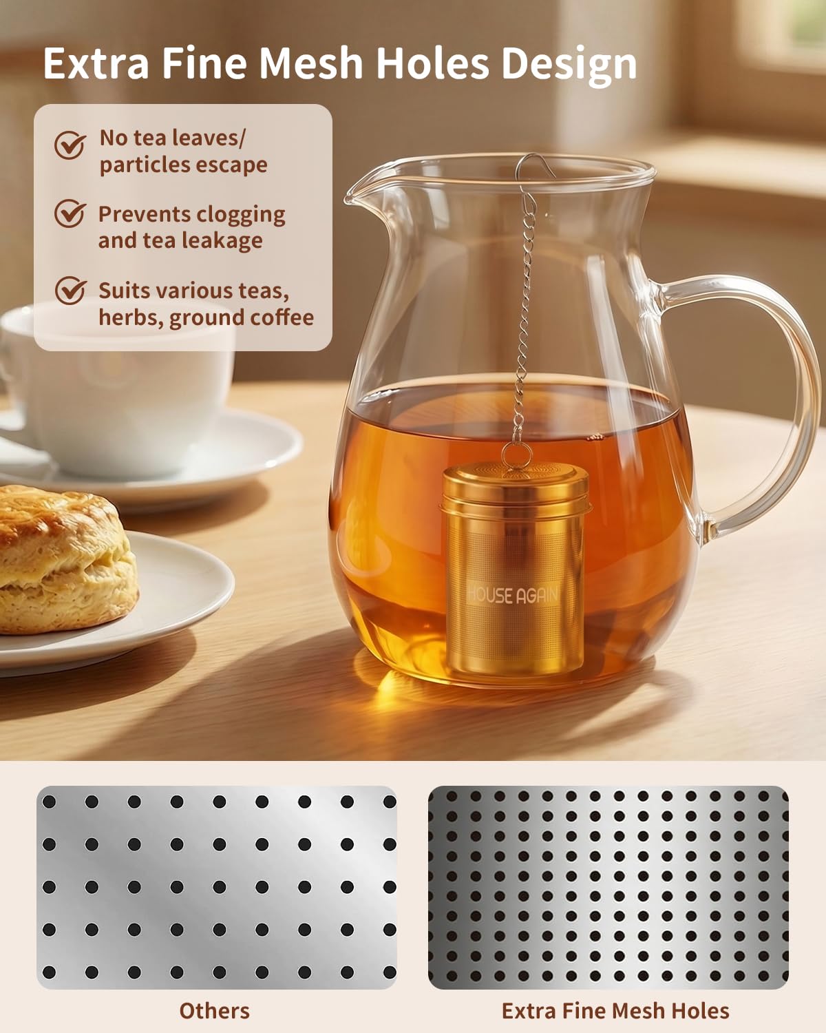 Upgraded Micron Mesh:The mesh of the House Again tea filters, thanks to a more advanced perforation process, can be micron-sized to trap the smallest tea particles. No tea dregs to bother you. Loose leaf tea steeper is Ideal to hold tea leaves, particles, or ground coffee.