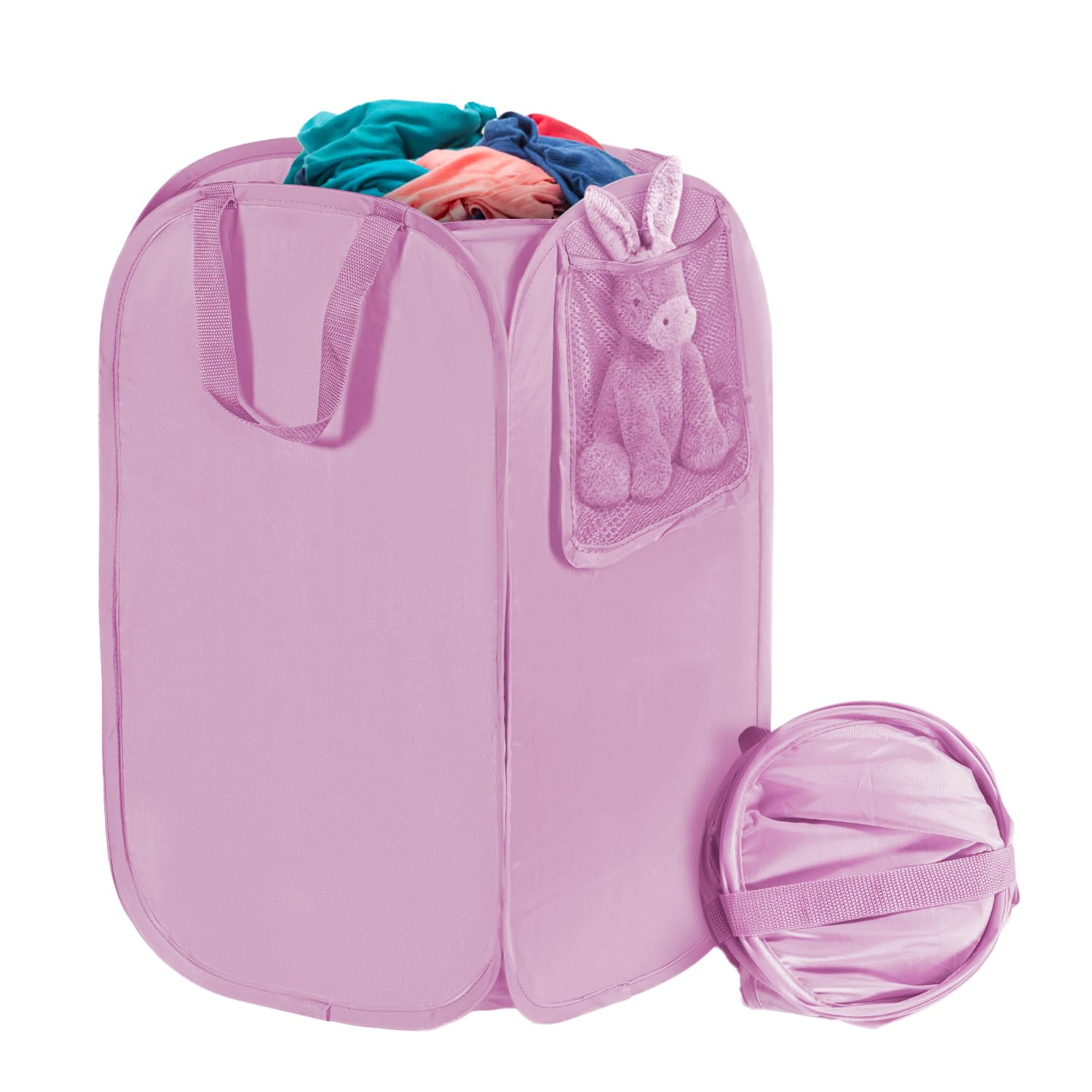 Polyester Strong Mesh Pop-up Laundry Hamper, Quality Pop Up Hampers for Laundry with Durable Handles Solid Bottom High Carbon Steel Frame, Easy to Open and Fold Flat for Storage(Light Pink)