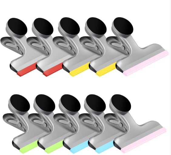 HOUSE AGAIN 10 Pack Stainless Steel Magnetic Chip Bag Clips Covered with Silicone - NO More Sharp Edges - Color Coded for Food Bags - Hang Postcards Heavy Duty for Kitchen and Office, 3 Inches Wide