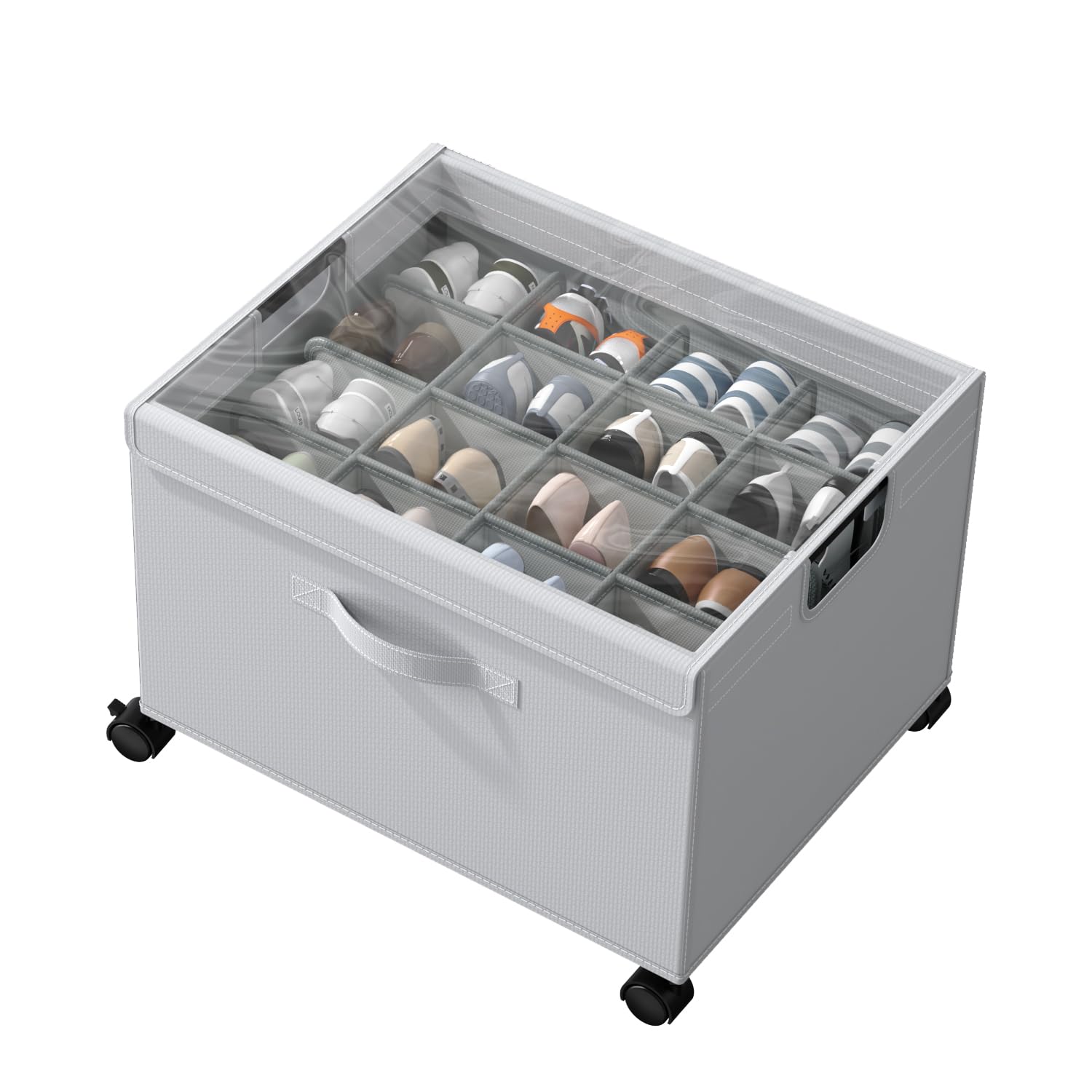 HOUSE AGAIN Shoe Organizer for Closet, Shoe Storage Boxes with 360° Wheels, Sturdy Metal Frame Fits up to 16 Pairs, Boots&Shoes Cubby Storage Containers with Adjustable Dividers and Clear Cover