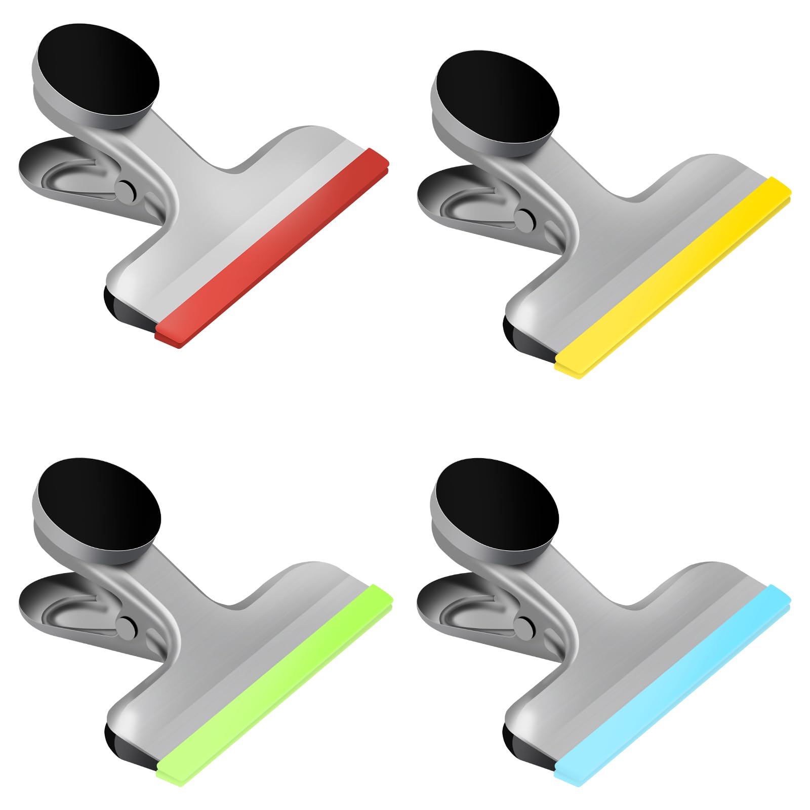 HOUSE AGAIN 4 Pack Stainless Steel Magnetic Chip Bag Clips Covered with Silicone - NO More Sharp Edges - Color Coded for Food Bags - Hang Postcards Heavy Duty for Kitchen and Office, 3 Inches Wide