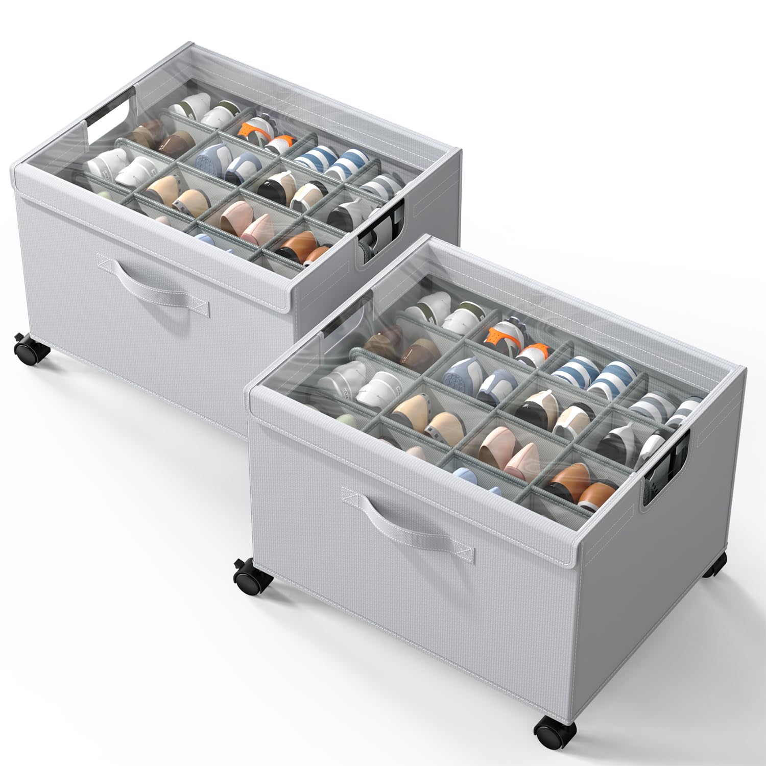 HOUSE AGAIN 2 Pack Shoe Organizer for Closet, Shoe Storage Boxes with 360° Wheels, Sturdy Metal Frame Fits up to 16 Pairs, Boots&Shoes Cubby Storage Containers with Adjustable Dividers and Clear Cover