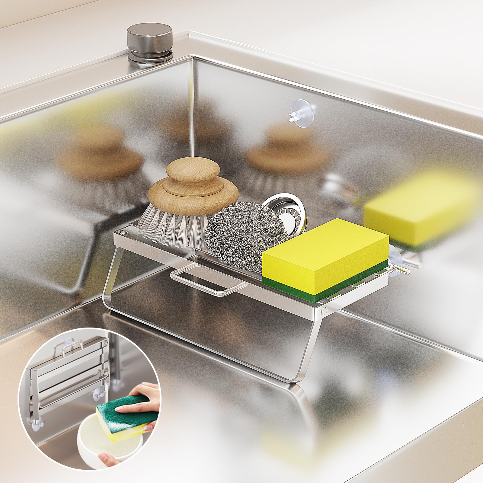 HOUSE AGAIN Sponge Holder for Kitchen Sink, 304 Stainless Steel Foldable Kitchen Sink Organzier for Storage Sponge, Dishes, Brushes, Sink Caddy and Kitchen Accessories for Kitchen Sink